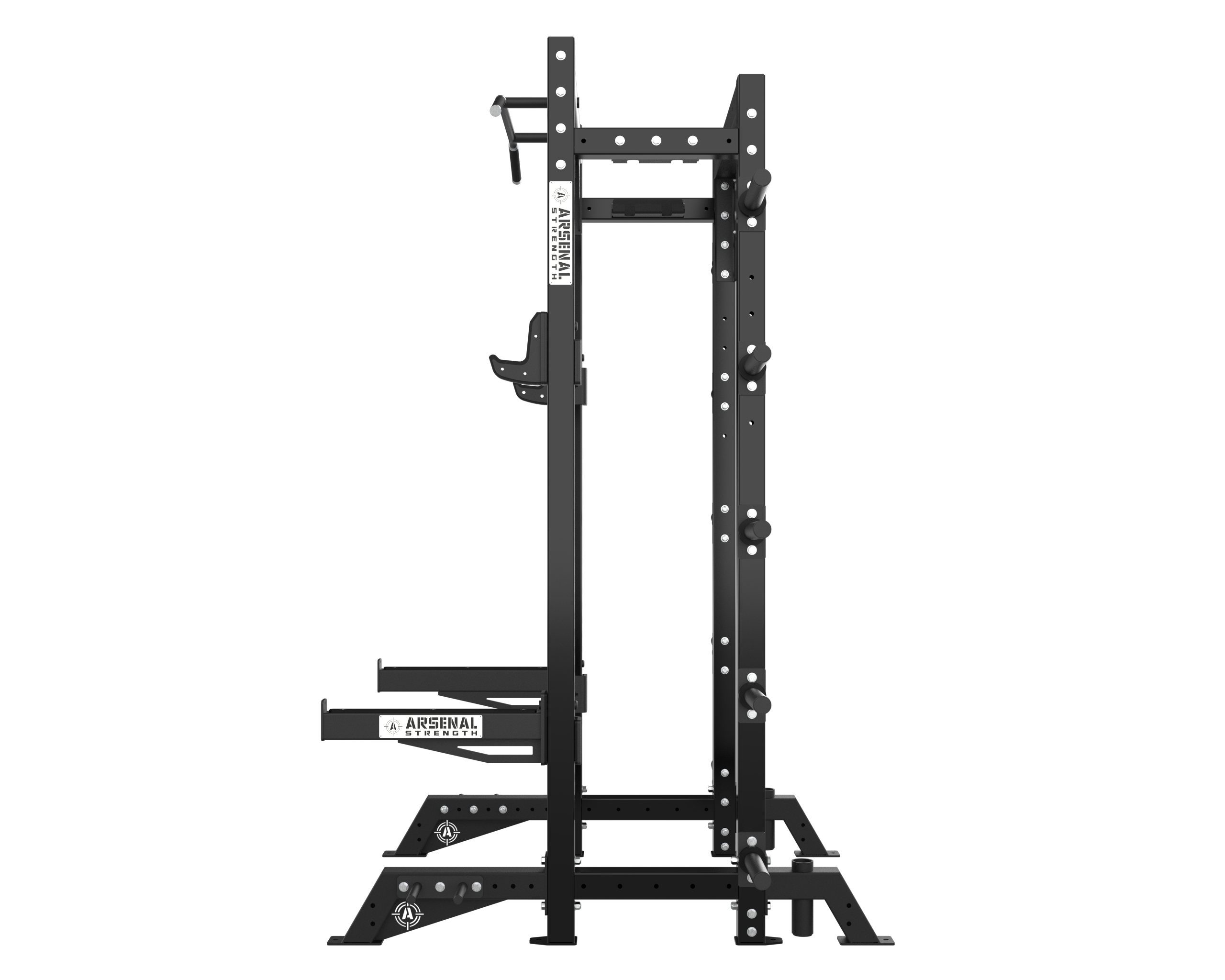 The Arsenal Strength Alpha Series 11 Gauge Racks are comprised of 3×3 11 gauge uprights, 2 inch incremental height adjustments, a customizable, standard bar storage, band pegs, and multi grip pull-up crossbars are highlights of this series. Available in Half Rack, Power Rack, and Double Half Rack options.